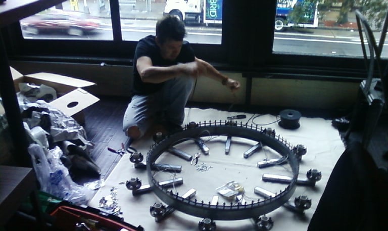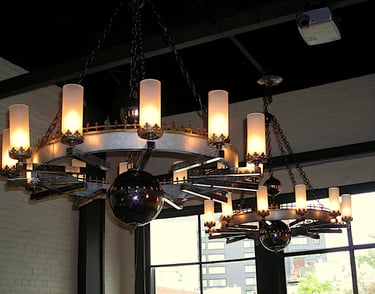 I first collaborated with Michael Babin more than 15 years ago for his restaurant, Evening Star in Alexandria, where I created custom chandeliers and booth sconces out of recycled Erector set pieces. It was a very creative project where I was allowed to experiment with both formal geometric structures in the chandelier but also incorporate some whimsical accents in the sconces like vintage espresso makers, cookie presses and even Mr. Peanut! For his fine dining restaurant Birch and Barley and attached lounge Churchkey in Logan Circle, Michael and designer Catherine Hailey created two beautiful spaces that incorporate organic design elements like slate covered columns and antique Indonesian wooden salt grinders with modern masterpieces like the 9 foot copper “beer organ”.