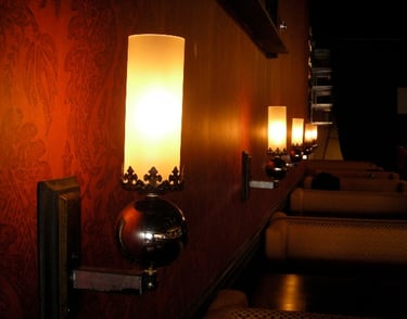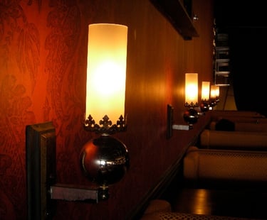 For the matching sconces in the booths, I also utilized antiqued mirrored arms and the same mercury glass balls, but instead mounted them onto reclaimed brass key plates, playing off the antique keys which are incorporated into the surface of the 75 foot bar that runs the length of the opposite wall. The decorative cups that hold the hurricane glass tubes are original to the reclaimed chandelier.
