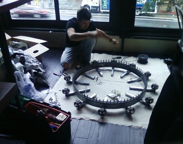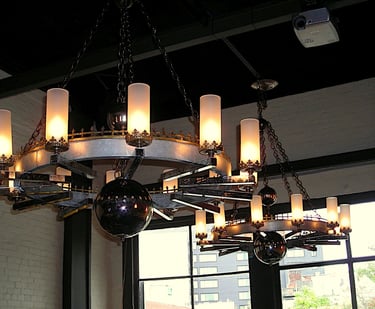 I was commissioned to build the 2 centerpiece chandeliers for the upstairs space, Churchkey, and 11 matching sconces for the booths. My clients wanted something that was modern and at the same time meshed into the Gothic undertones of the décor. I started with two 4 ft. rings which were reclaimed from some old chandeliers that had seen better days. I refinished the surfaces to expose the original silver and brass accents and added 12 telescoping arms around the base which I covered in antiqued mirror. I suspended the rings from heavy chains to mimic the original fixture and in the middle, I dangled two hand-blown mercury glass balls. When looking up into the chandelier from below, it almost appears like a sun with rays bursting from the center ball. The reflective qualities of the balls and the arms themselves give the piece a beautiful shimmer both in daytime with the natural light flooding in from the floor to ceiling windows, and in the evening when the windows themselves reflect the inside space.