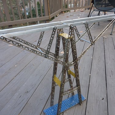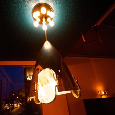 The main fixture is a bridge-inspired track system that allows for the servers to move the pendant lights up and down the length of the dining area to accommodate different table configurations. I used hundreds of individual Erector girder pieces from various vintage sets that I had been collecting over the years, and then hooked glass insulator pendant lights onto wheeled carts that roll on the track. I made matching Deco inspired sconces for the booths, and two hanging fixtures for the front tables made of aluminum "spinners" from retired aircraft engines.