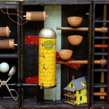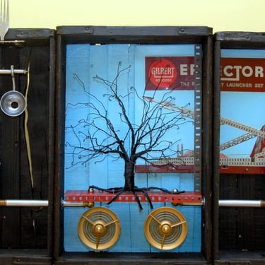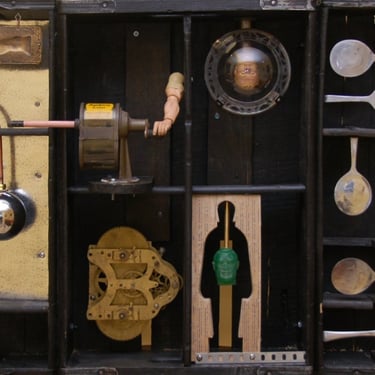When thinking about the art pieces that were to hang over each booth, I wanted to create an installation with found objects that would be conversation pieces for the diners and provide enough interest and complexity so that each time you returned to the restaurant something new and unexpected caught your eye. The old sconces that I had installed in the original restaurant using items like a Mr. Peanut figurine, a vintage espresso maker, antique copper cookie presses, etc. had become so iconic to the restaurant that I wanted to make sure the loyal diners who had patronized the restaurant for years still felt that spirit of whimsy. Where I could, I repurposed some of those items throughout the restaurant.