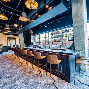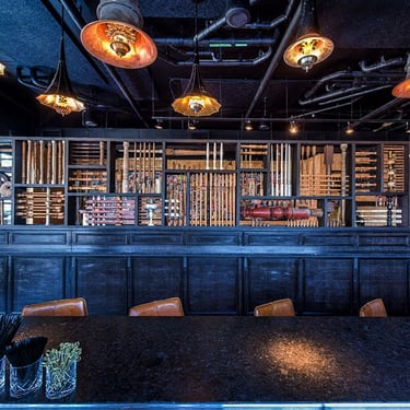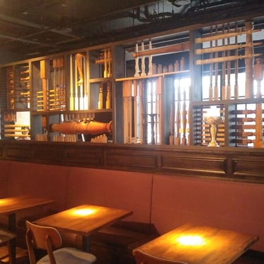 To divide the bar space from the booths without closing it in, we used hundreds of reclaimed wood bannisters and pieces to create a sculptural wall that was inspired by one of my favorite artists, Louise Nevelson.