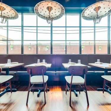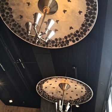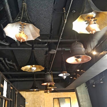 Hazel was a great collaboration with Catherine Hailey of the design firm Hailey Design. The restaurant in the trendy 14th St. corridor had 3 distinct spaces to consider in addition to the outdoor area. For the entry and bar area, I had always loved the organic beauty of old victrolas and wanted to incorporate them into this space. I wanted the guests to be surprised as they walked under them, so I used a reflective foil technique for the insides and created a design to mimic the stamen of a flower.