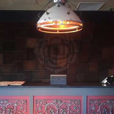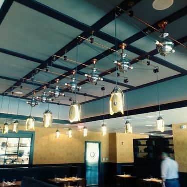 Behind the hostess stand, we used old wooden factory boxes to add texture to the space and hung one of 2 fixtures that were made from a shell of a studio light from Disney. The bar lights were built to attach to the tables so provide an intimate setting for small groups. In the main dining area, I used pulleys, ceramic insulators and chrome ice buckets to create a 15ft. installation. Finally, the booth sconces featured photographic slide carousels